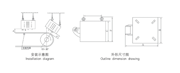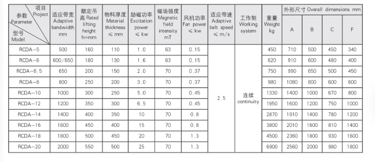 RCDA series air-cooled electromagnetic iron remover, the heat disipation mode of internal excitation coil is forced air cooling by airconditioning fan ar axial flow fan; When the warking environmant of the iran rarover is relatively clean, the air conditicning fan is usedlor heat dissipalion, and when the working environment is bad isuch as large dust and coal dust). the axial flow fan is used for headisipation, which is used to remove iron from any material an the conveyor belt, and plays a reiable role in protecting various types olcrushers, mils and other equipment. vain fealures: computer sirulation desigh. Sirple structure and easy maintenance. Strong magnetifield, large power, and large magnetic penetraticn depth, Axial flow fan has good heat dissipation effect and low temperature rise olelectromagnetic coil