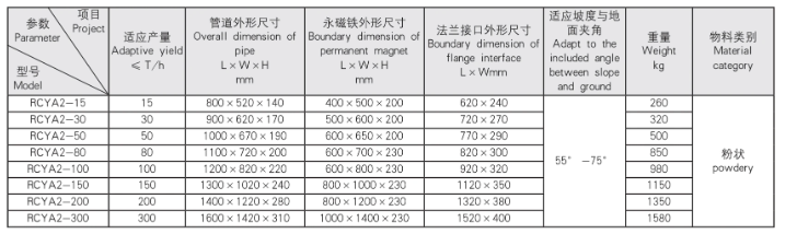 Main technical parameters of RCYA2 series permanent magnet iron remover: