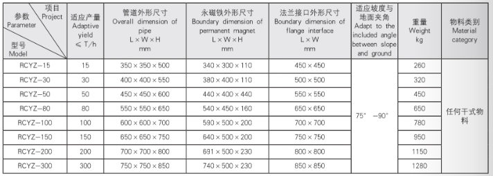 RCYZ series ofpipe-type permanent magnet iron remover is our company’spatented product.it uses high performance material NdFeB as the magneticsource,and wear-resistant lining plate is one for use and one for standby. lthas the characteristics of small size, light weight, strong magnetic field. cleariron removal, no energy consumption, convenient operation and long service life.When working,ferromagnetic materials mixed in bulk materials will be firmlyadsorbed on the iron separator when passing through the strong magnetic field areaof the iron separator, When removing ferramaanetic cbjects, just open the sealincdoor. This series of products are widely used in removing iron from powdergranular and block materials in cement, power, chemical, building materials.food ceramics ad other industries