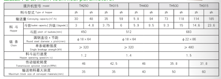 Compared with the HL type, the TH type bucket elevatar has the advantages of large conveying capacity, high lifting height, lang service life, high operational reliability. energy saving anc efficiency.maln performance and parermetes comply wit, the, 1e3g26.1 -8s “venleal b ckel Elevetor safe sealing,and easy maintenance.standard, and the traction ring chain complies with the T36-80 “High Strength Ring Chain fo铠目面ining” standard.
