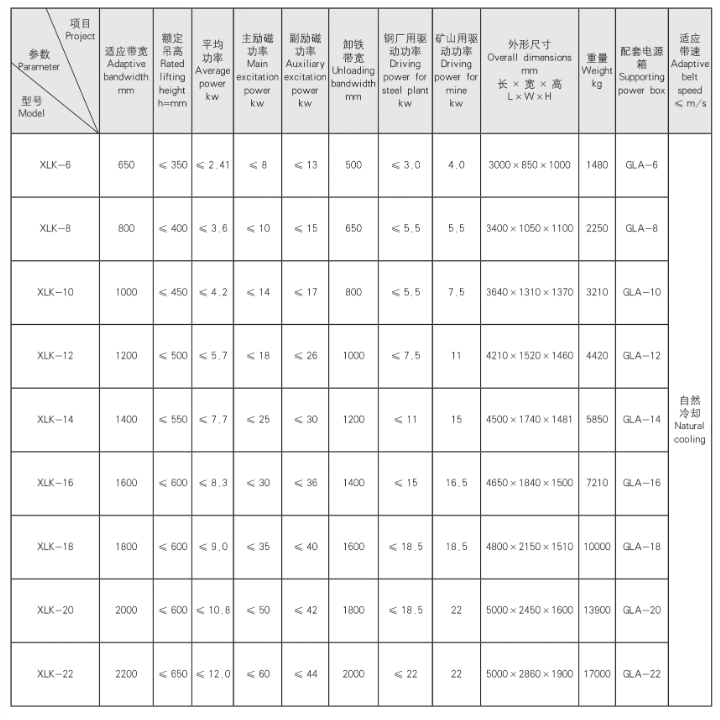 XLK magnetic ore iron removal systom is installed on the conveyor transporting materials. The metal detector is installed at the front, thaïelt type electromagnetic iron remover is installed on the belt conveyar, and the non-magnetic material distribution platform catches thedrawn iron pieces bohind the iron remover. The rectifier control cabinet connects the metal detector and the belt type iron remover, Whenthe metal detector detects the iron signal, it transmits the signal to the rectifier control cabinet. The conirol cabinet starts the iron unloadingbelt of the belt type iron remover and excites it. The iron parts and soe materials with strong magnetism are simultaneously sucked ypunder the main magnetic pole and move backward through the rotation of the iron unloading bet, Since the magnetic cre and iron pars arevery diferent in shape and magnetism, after three times of sorting, Most of the magnetic ores fall anto the feeding belt again. A smallamount of materials are taken with the iron pieces to the non-magetic material separation platorm for re sepration, After fou times olseparation, good iron removal effect with less ore can be achieved